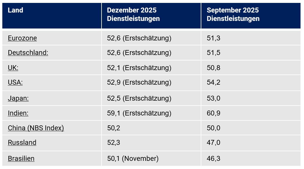 Der Dienstleistungssektor bewegte sich im 4. Quartal 2025 laut Einkaufsmanagerindices in einer Gesamtbetrachtung (Ausnahmen USA, Japan, Indien) im erhöhten Wachstumsmodus und sorgte für die gute Performance der Einkaufsmanagerindices bezüglich der Gesamtwirtschaft (Composite Indices).